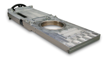 A slide gate has a flat closure element that slides into the flow stream to stop the materials and high pressure.